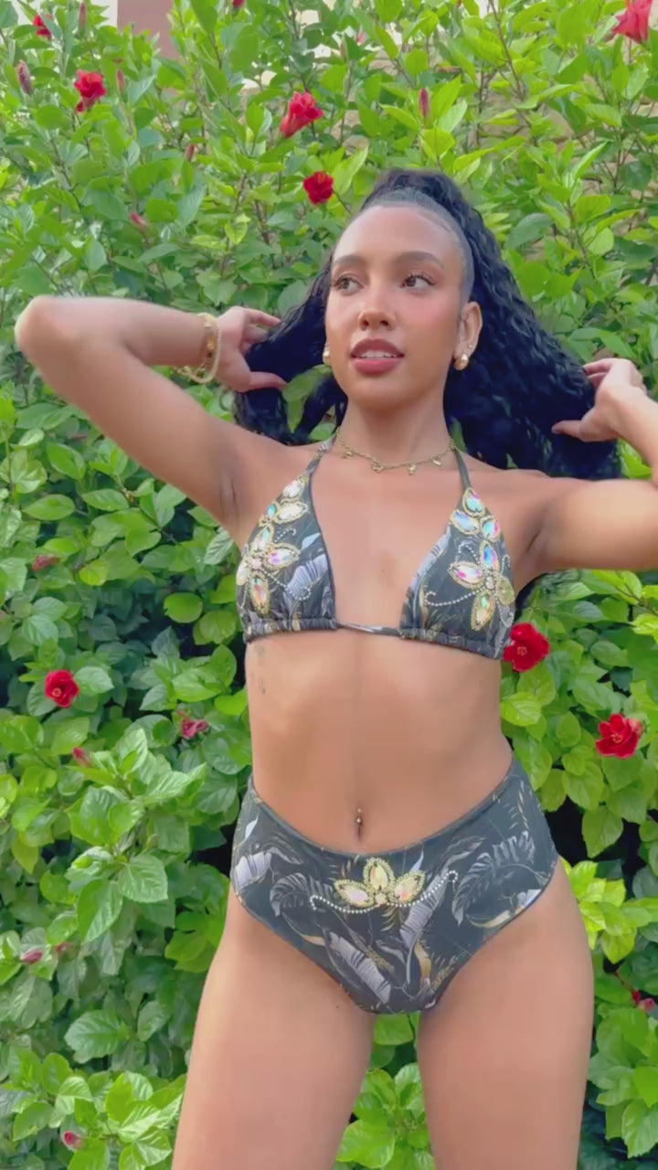 Two-piece bikini with an exotic design and vibrant details. The triangle top enhances the figure, while the high-waisted bottom provides comfort and style. Perfect for looking radiant and confident at any beach destination.
