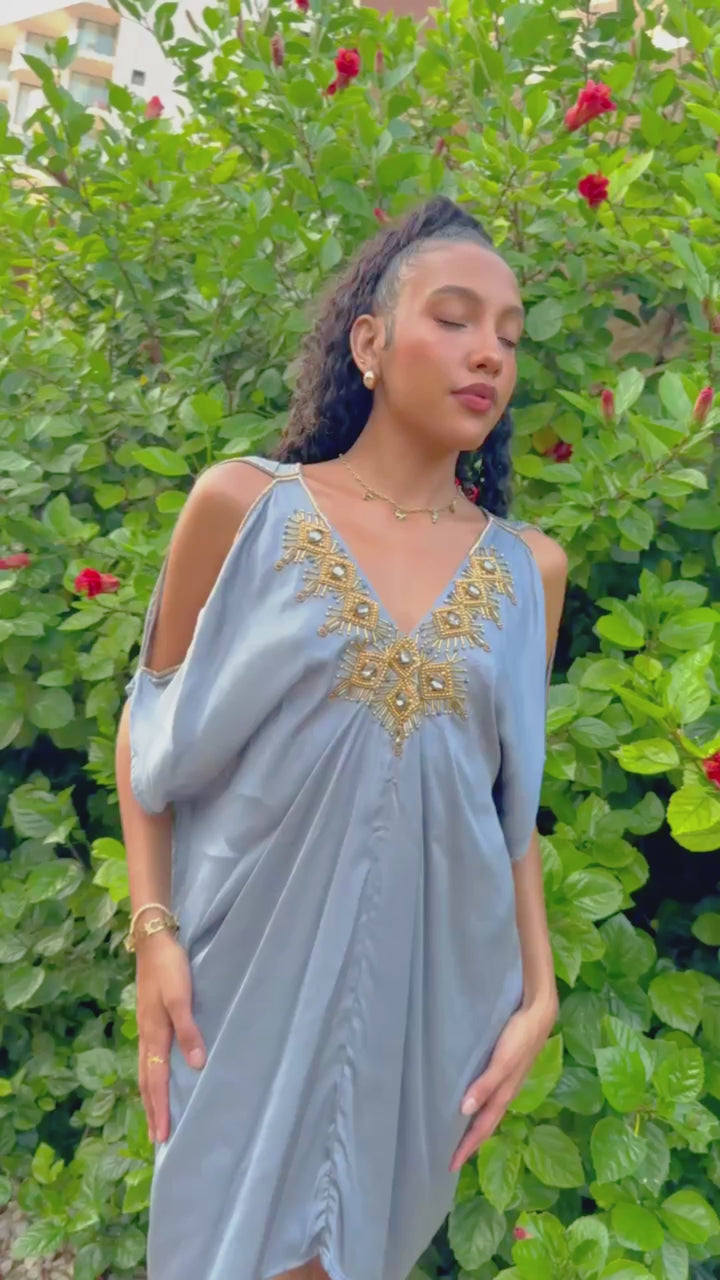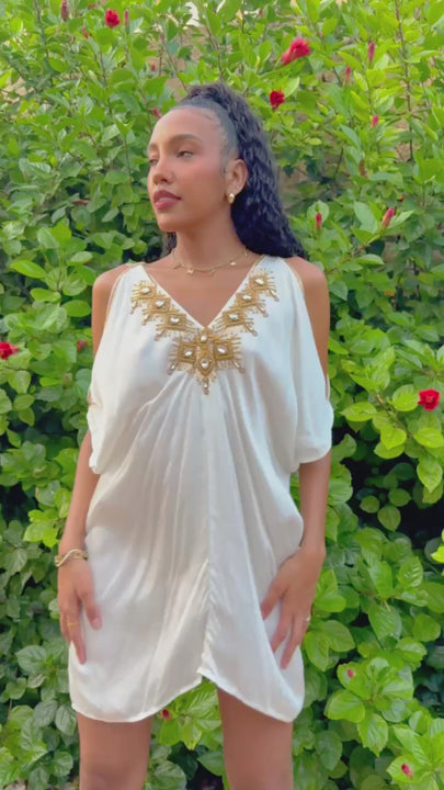 Vestido corto estilo túnica con aberturas en los hombros y bordado artesanal en el escote. Ideal como prenda ligera y elegante para días de verano o como salida de playa.