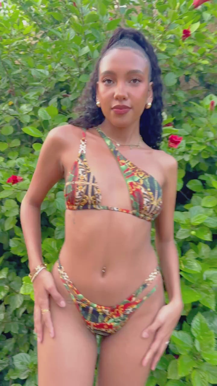 Bikini de diseño exclusivo con estampado elegante y detalles dorados. Su top asimétrico y cadenas metálicas realzan la silueta con un estilo sofisticado y moderno, ideal para destacar en cualquier destino de playa o piscina.